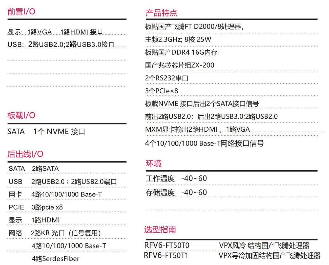 采用國產(chǎn)飛騰處理器FTD2000/8+ZX-200芯片組按國產(chǎn)設計,6U VPX規(guī)格。具備豐富的外圍接口;設計了高效 的散熱系統(tǒng),可顯著提高處理器的浮點運算性能,以太網(wǎng)、PCIe、支持高帶寬數(shù)據(jù)傳輸,滿足視頻采集與處理、 雷達和聲吶等應用對高速數(shù)據(jù)傳輸?shù)囊?。專為惡劣環(huán)境 使用而設計,滿足無人機、裝甲車、水面艦艇等軍工領 域。
