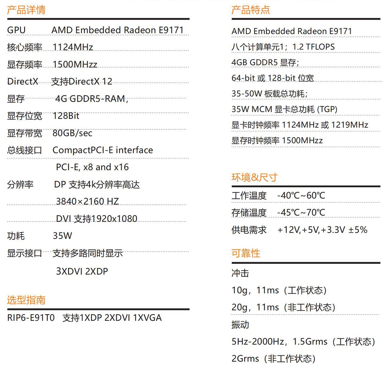 一 款 CPCI-E發(fā) 燒 級(jí) 獨(dú) 立 顯 卡 , 采 用 AMD Embedded Radeon E9171圖 形 芯 片 , 14nm FinFET 北 極 星 架 構(gòu) 八 個(gè) 計(jì) 算 單 元1;1.2 TFLOPS 4GB GDDR5 顯存;64-bit 或 128-bit 位寬35W板載總功 耗 ; (TGP)顯 卡 時(shí) 鐘 頻 率 1124MHz 或 1219MHz顯 存 時(shí) 鐘 頻 率 1500MHzzAMD 寬域 (Eyefinity) 技術(shù)支持多達(dá)五個(gè)顯示輸出24K