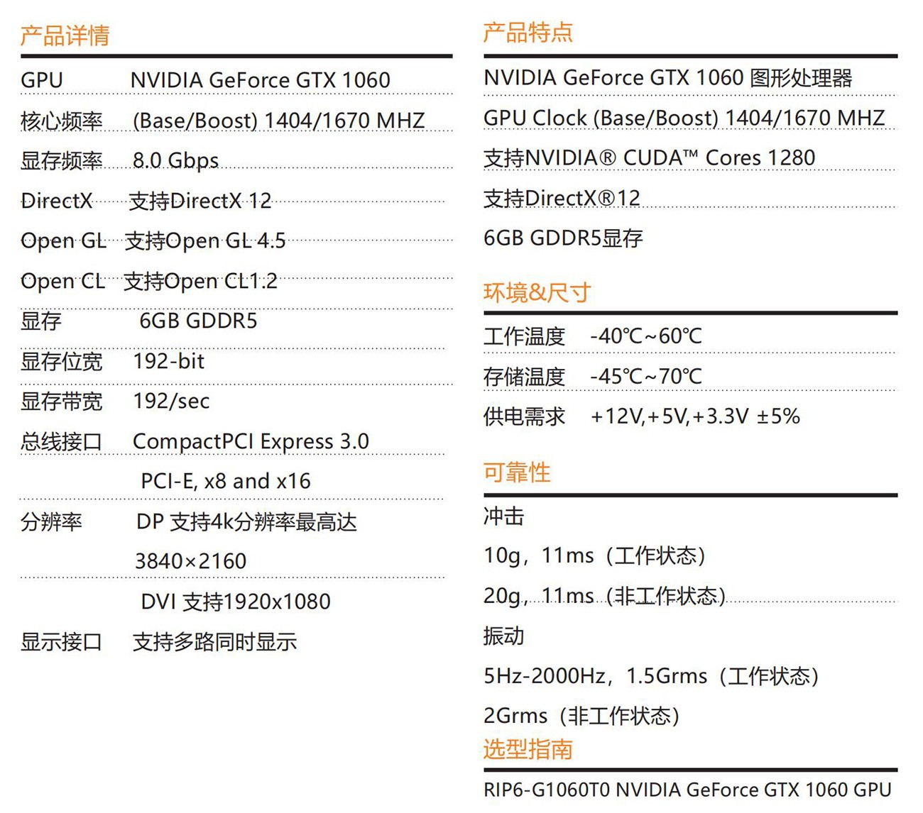一款CPCI-E獨(dú)立顯卡,采用NVIDIA GeForce GTX 1060圖形芯片, 顯存時(shí)鐘為8.0 GBPS為192Bit 6G GDDR5顯存 支持Open GL 4.5支持 DirectX 12支持Open CL 1.2支持NVIDIA? CUDA? Cores 1280 等技術(shù);具有出色多顯示輸出接口、該產(chǎn)品有良好計(jì)算和圖形性能,適合高性能的應(yīng)用場(chǎng)合,這使得顯示模塊能夠應(yīng)對(duì)最復(fù)雜的并行應(yīng)用程序,比如地形 繪圖雷達(dá)導(dǎo)航和氣象繪圖,面部和手勢(shì)識(shí)別,以及生物識(shí)別分析等。