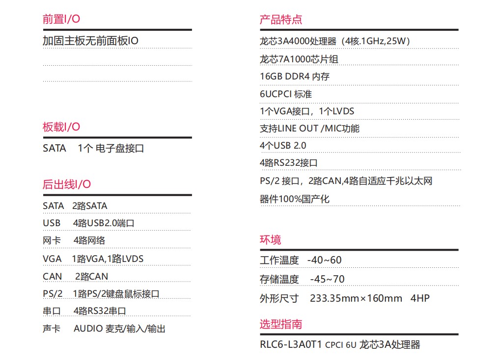 采用國產(chǎn)龍芯3A4000+7A1000處理器設(shè)計,CompactPCI 6U架 構(gòu),符合PICMG2.0 R3.0、PICMG2.16、PICMG2.3標(biāo)準和海軍標(biāo) 主板標(biāo)準。該產(chǎn)品具備優(yōu)越的數(shù)據(jù)處理能力、圖形顯示能力、網(wǎng)絡(luò) 通訊能力、雷達和聲吶等應(yīng)用對高速數(shù)據(jù)傳輸?shù)囊?。專為惡劣環(huán) 境使用而設(shè)計,適用于對實時數(shù)據(jù)處理、通訊、自動化、軍工等領(lǐng) 域。